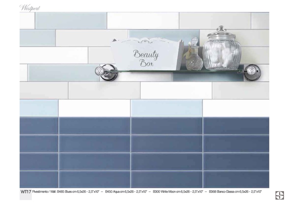 Rivestimento / Wall: B485 Blues cm 6,5x26 - 2,5”x10” – B450 Aqua cm 6,5x26 - 2,5”x10” – B300 White Moon cm 6,5x26 - 2,5”x10” – B368 Bianco Glassa cm 6,5x26 - 2,5”x10”