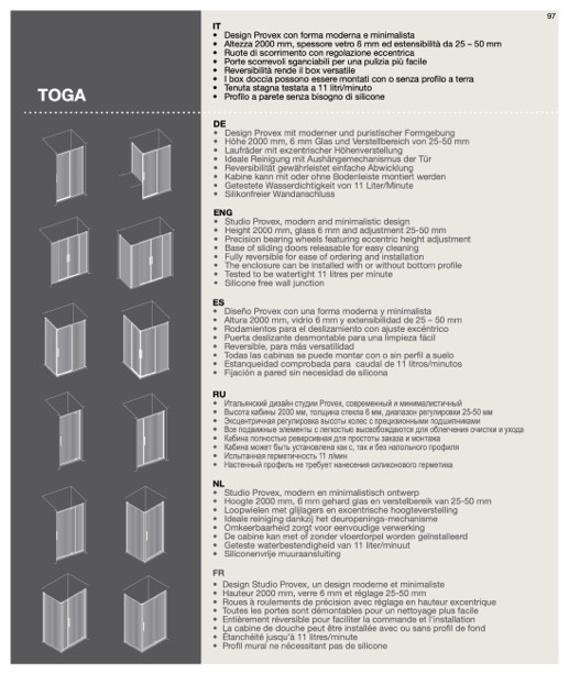 • Высота кабины 2000 мм, толщина стекла 6 мм, диапазон регулировки 25-50 мм