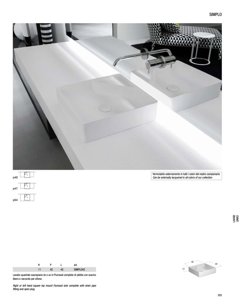 Lavabo quadrato soprapiano dx o sx in Flumood completo di piletta con scarico