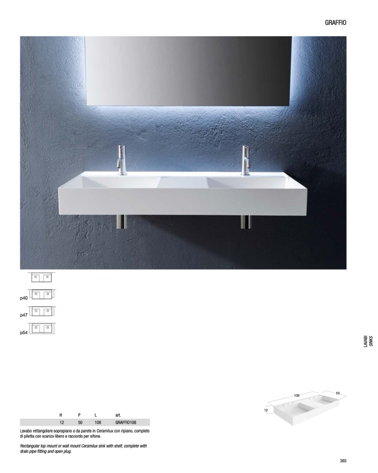 Lavabo rettangolare soprapiano o da parete in Ceramilux con ripiano, completo