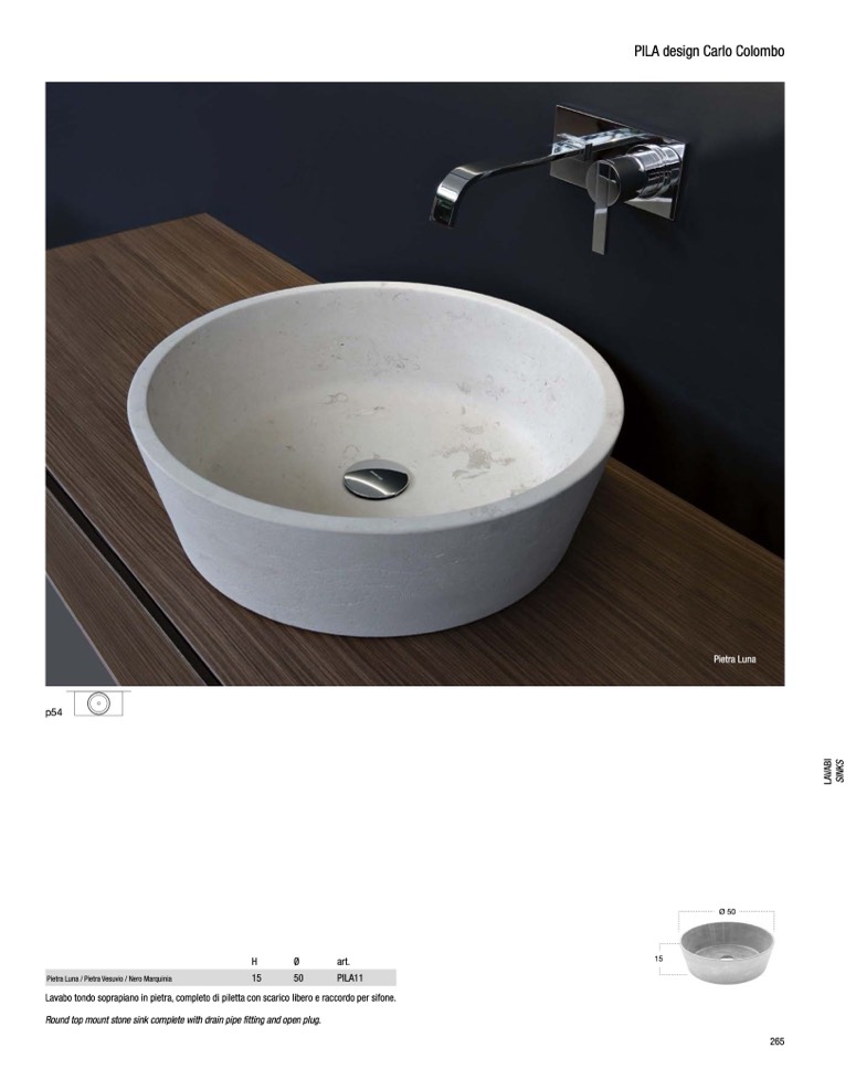 Lavabo tondo soprapiano in pietra, completo di piletta con scarico libero e raccordo per sifone.