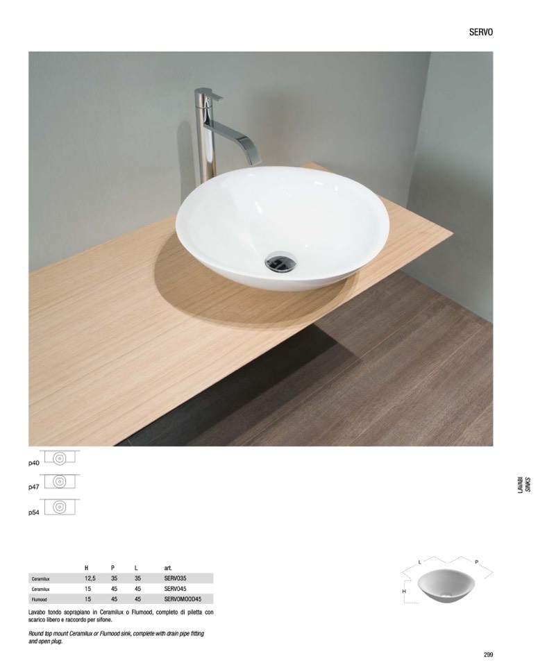 Lavabo tondo soprapiano in Ceramilux o Flumood, completo di piletta con