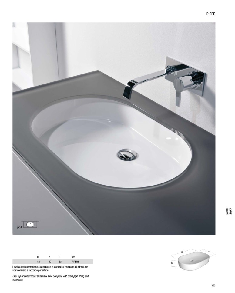 Lavabo ovale soprapiano o sottopiano in Ceramilux completo di piletta con