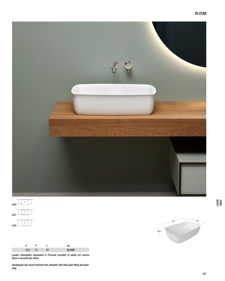 Lavabo rettangolare soprapiano in Flumood completo di piletta con scarico