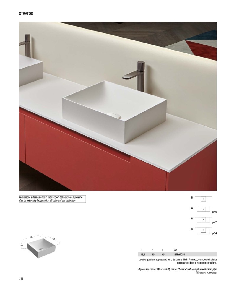 Lavabo quadrato soprapiano (A) o da parete (B) in Flumood, completo di piletta