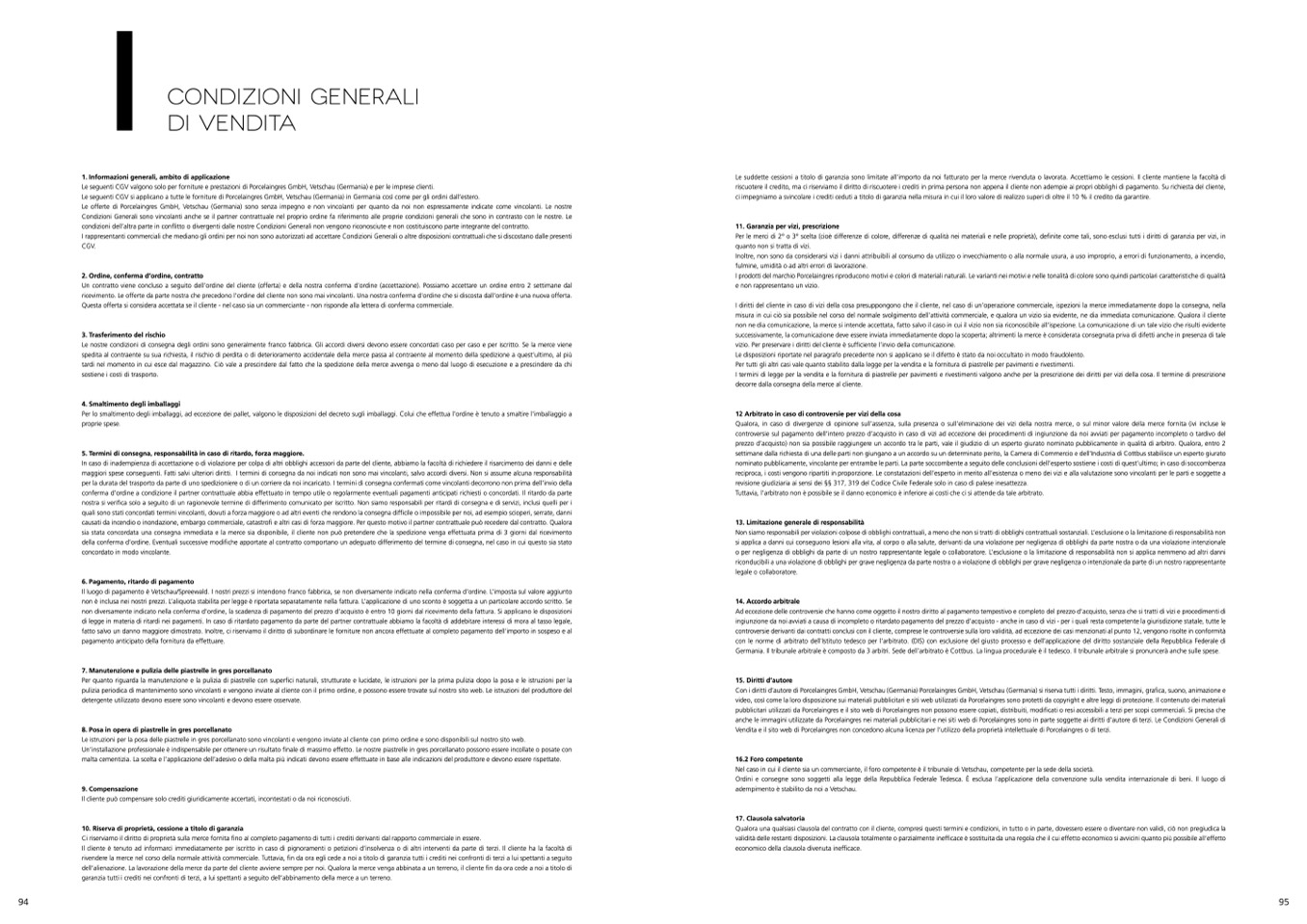 Le seguenti CGV si applicano a tutte le forniture di Porcelaingres GmbH, Vetschau (Germania) in Germania così come per gli ordini dall’estero.