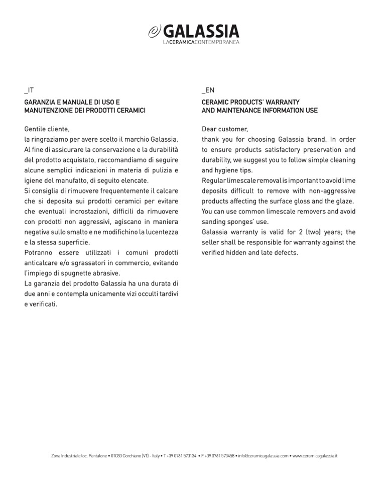 ZonaIndustrialeloc.Pantalone•01030Corchiano(VT)-Italy•T+390761573134 •F+390761573458•info@ceramicagalassia.com•www.ceramicagalassia.it