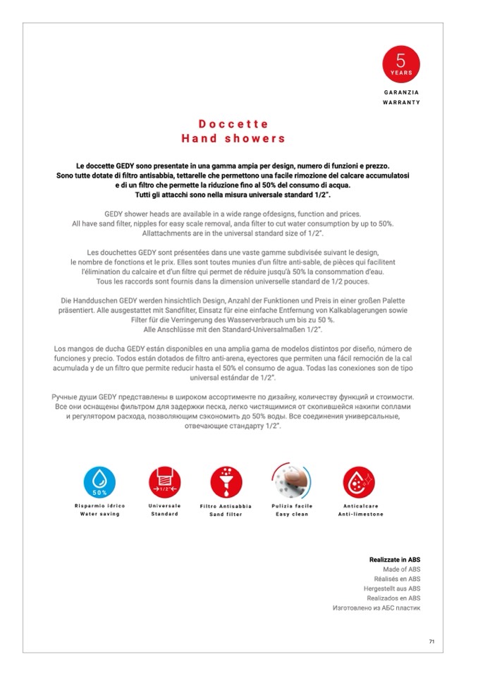 Le doccette GEDY sono presentate in una gamma ampia per design, numero di funzioni e prezzo.