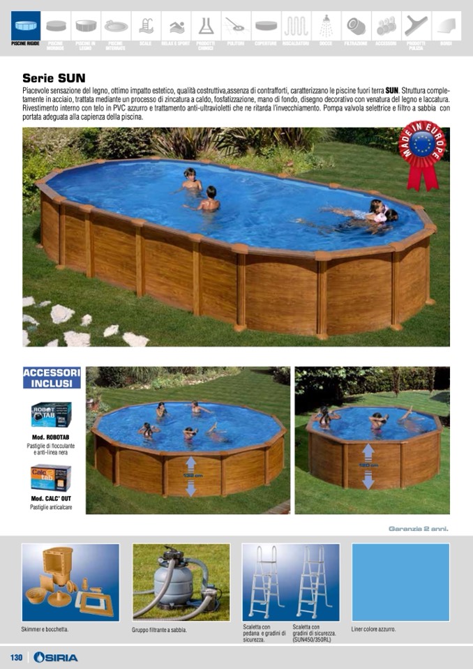 Piacevole sensazione del legno, ottimo impatto estetico, qualità costruttiva,assenza di contrafforti, caratterizzano le piscine fuori terra SUN. Struttura comple-