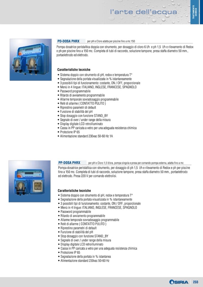per pH e Cloro 1,5 lt/ora, pompa singola e presa per comando pompa esterna, adatta fino a mc