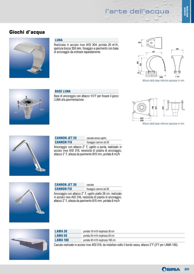 Cascata realizzata in acciaio inox AISI 316, da installare sotto il bordo vasca, attacco 2”F (3”F per LAMA 100).