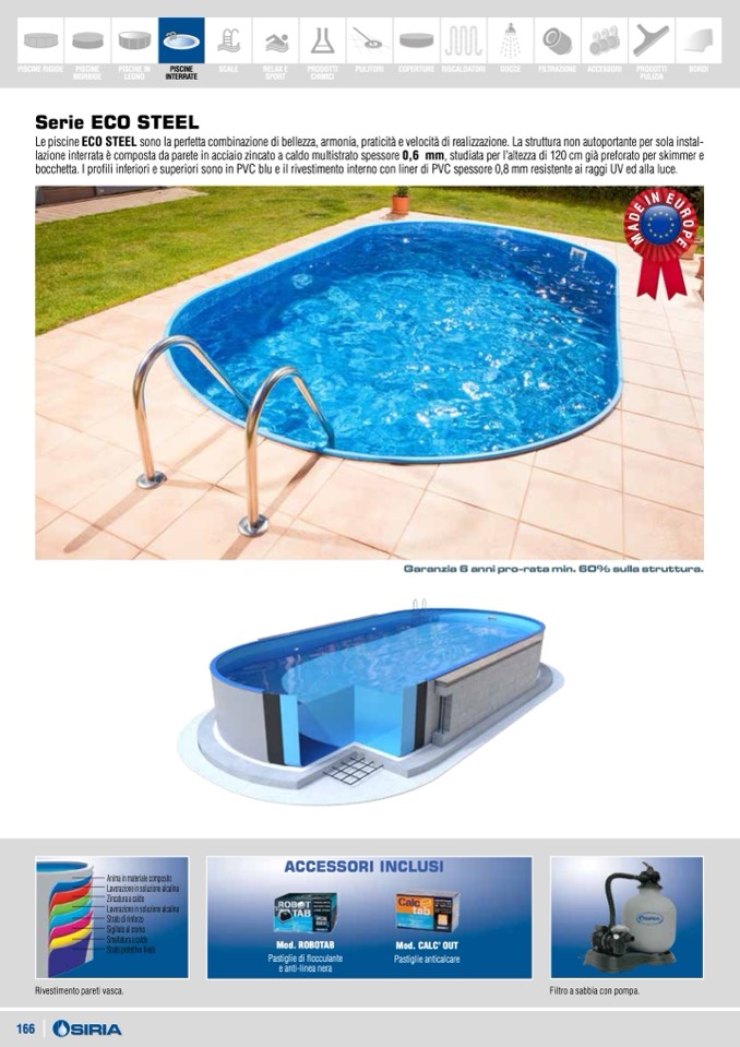 lazione interrata è composta da parete in acciaio zincato a caldo multistrato spessore 0,6 mm, studiata per l’altezza di 120 cm già preforato per skimmer e