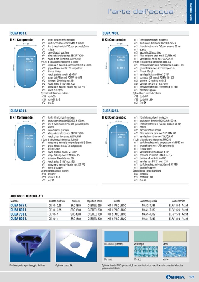 Optional liner in PVC spessore 0,8 mm. con i colori da specificare al momento dell’ordine