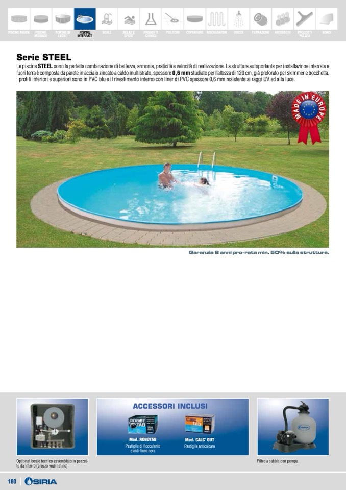 fuori terra è composta da parete in acciaio zincato a caldo multistrato, spessore 0,6 mm studiato per l’altezza di 120 cm, già preforato per skimmer e bocchetta.