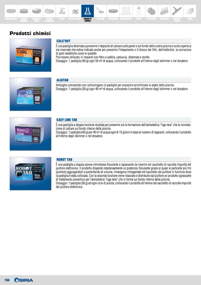 Dosaggio: 1 pastiglia (40 g) ogni 50 m3 di acqua, collocando il prodotto all’interno degli skimmer o nel dosatore.