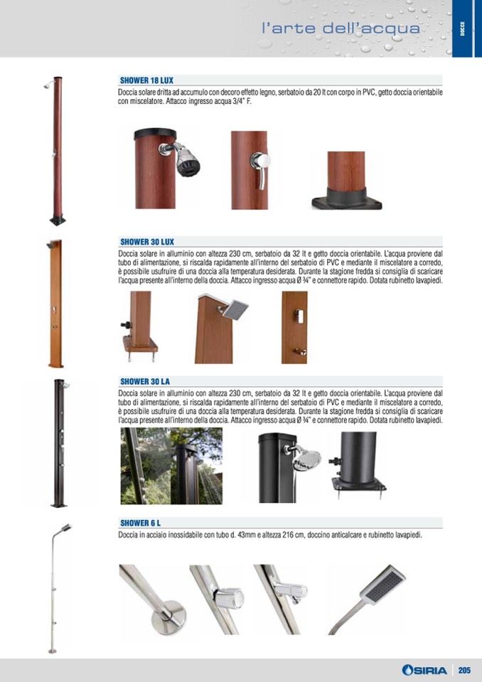 Doccia solare in alluminio con altezza 230 cm, serbatoio da 32 lt e getto doccia orientabile. L’acqua proviene dal