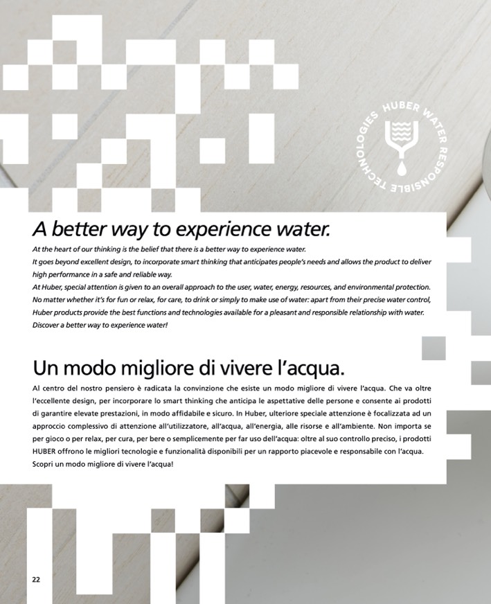 HUBER offrono le migliori tecnologie e funzionalità disponibili per un rapporto piacevole e responsabile con l’acqua.