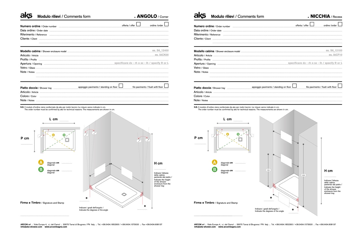 N.B. Il modulo d’ordine viene confermato da aks per motivi tecnici. Le misure vanno indicate in cm.