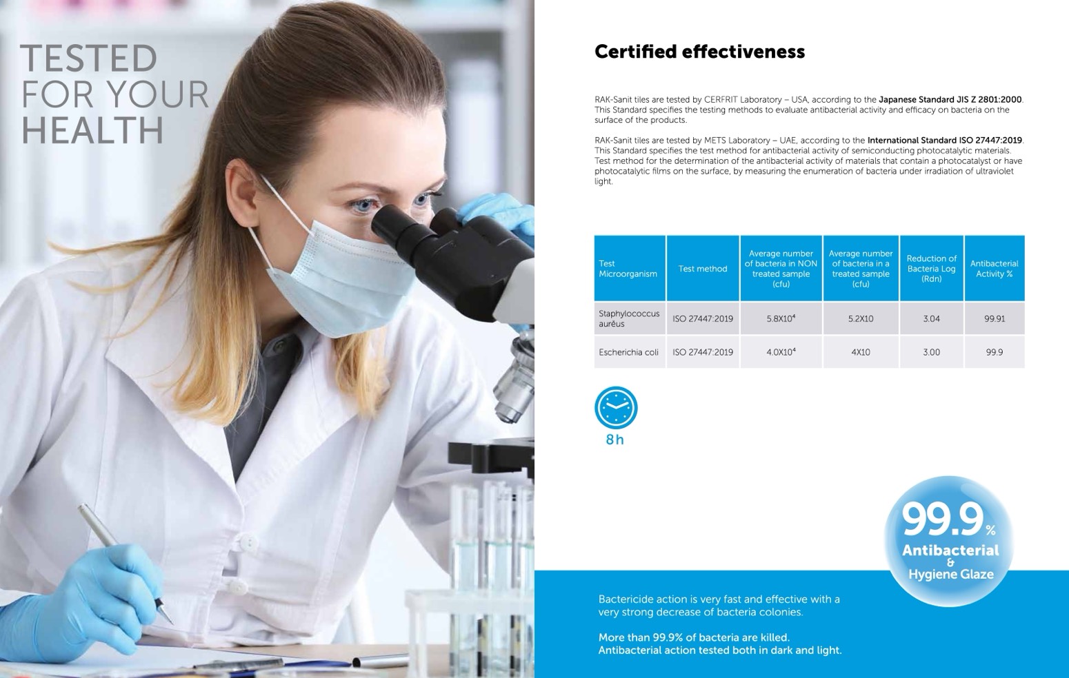 RAK-Sanit tiles are tested by CERFRIT Laboratory – USA, according to the Japanese Standard JIS Z 2801:2000.