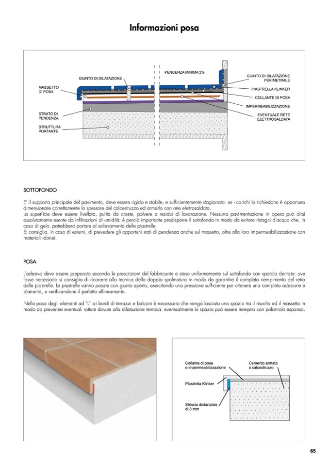 Si consiglia, in caso di esterni, di prevedere gli opportuni stati di pendenza anche sul massetto, oltre alla loro impermeabilizzazione con
