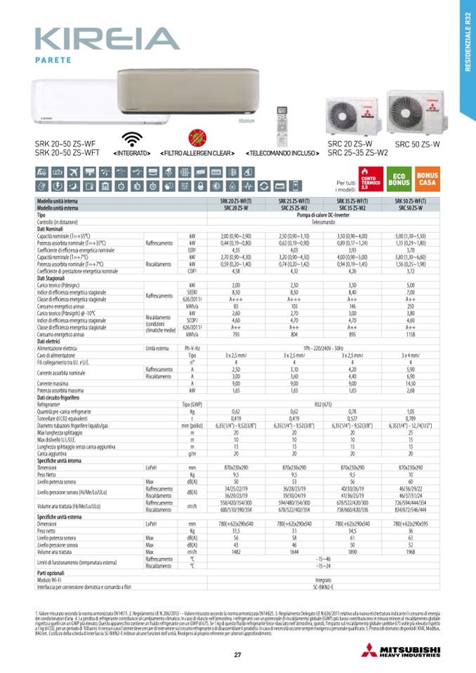 1. Valore misurato secondo la norma armonizzata EN14511. 2. Regolamento UE N.206/2012 - - Valore misurato secondo la norma armonizzata EN14825. 3. Regolamento Delegato UE N.626/2011 relativo alla nuova etichettatura indicante il consumo di energia