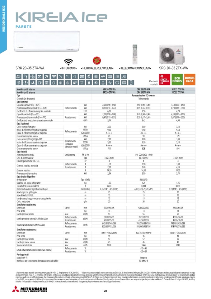 1. Valore misurato secondo la norma armonizzata EN14511. 2. Regolamento UE N.206/2012 - - Valore misurato secondo la norma armonizzata EN14825. 3. Regolamento Delegato UE N.626/2011 relativo alla nuova etichettatura indicante il consumo di energia