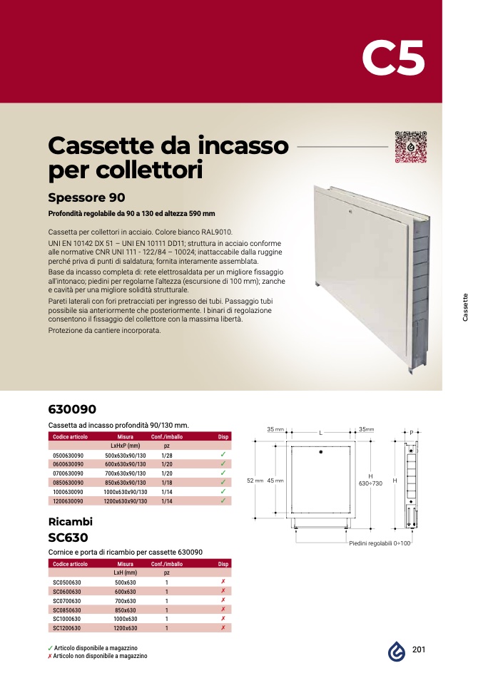 all’intonaco; piedini per regolarne l’altezza (escursione di 100 mm); zanche