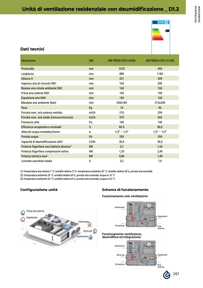 (1) Temperatura aria esterna 7 °C; umidità relativa 72 %. temperatura ambiente 20 °C; umidità relativa 28 %, portata aria nominale