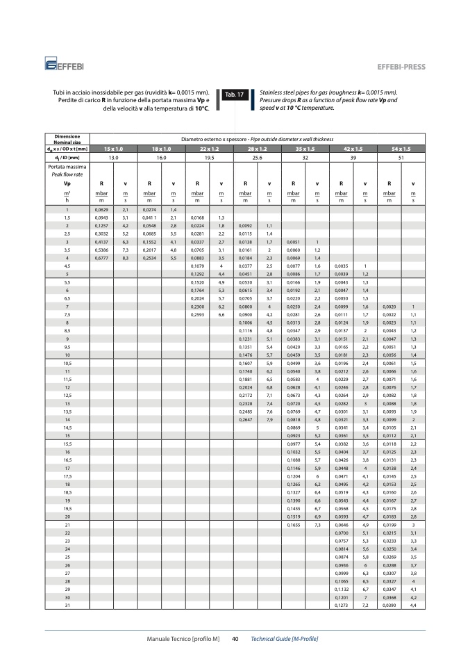 Tubi in acciaio inossidabile per gas (ruvidità k= 0,0015 mm).