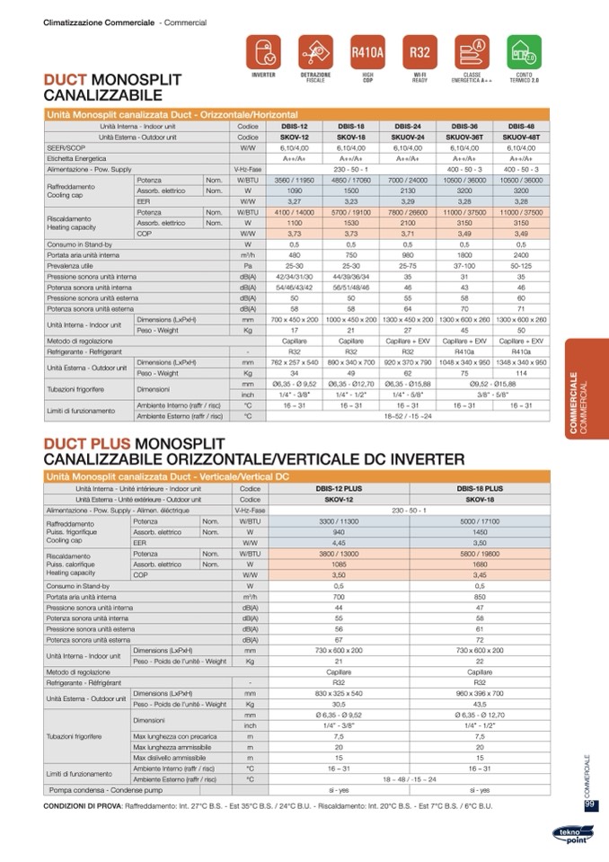 CONDIZIONI DI PROVA: Raffreddamento: Int. 27°C B.S. - Est 35°C B.S. / 24°C B.U. - Riscaldamento: Int. 20°C B.S. - Est 7°C B.S. / 6°C B.U.