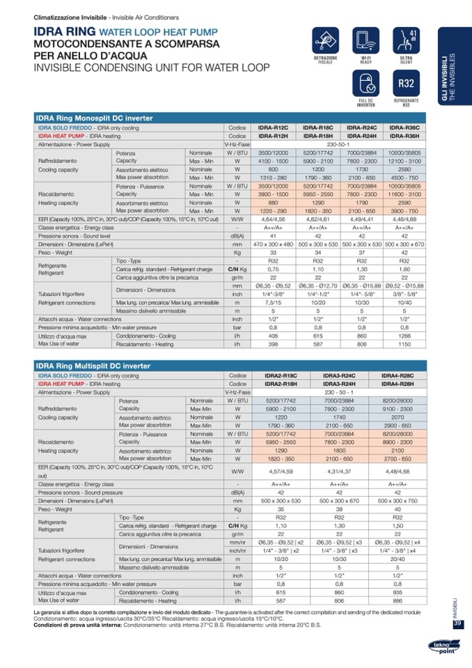 Condizionamento: acqua ingresso/uscita 30°C/35°C Riscaldamento: acqua ingresso/uscita 15°C/10°C.