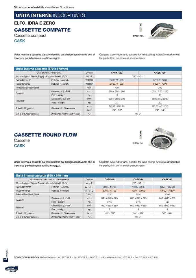 CONDIZIONI DI PROVA: Raffreddamento: Int. 27°C B.S. - Est 35°C B.S. / 24°C B.U. - Riscaldamento: Int. 20°C B.S. - Est 7°C B.S. / 6°C B.U.