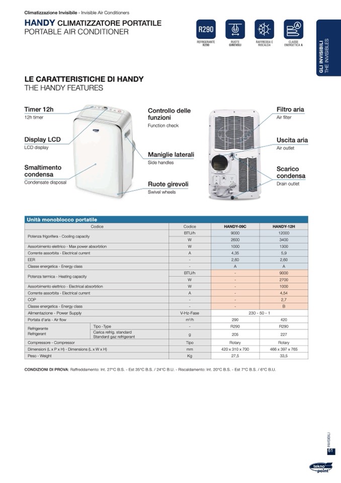 CONDIZIONI DI PROVA: Raffreddamento: Int. 27°C B.S. - Est 35°C B.S. / 24°C B.U. - Riscaldamento: Int. 20°C B.S. - Est 7°C B.S. / 6°C B.U.