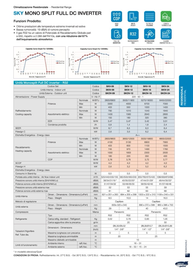 CONDIZIONI DI PROVA: Raffreddamento: Int. 27°C B.S. - Est 35°C B.S. / 24°C B.U. - Riscaldamento: Int. 20°C B.S. - Est 7°C B.S. / 6°C B.U.