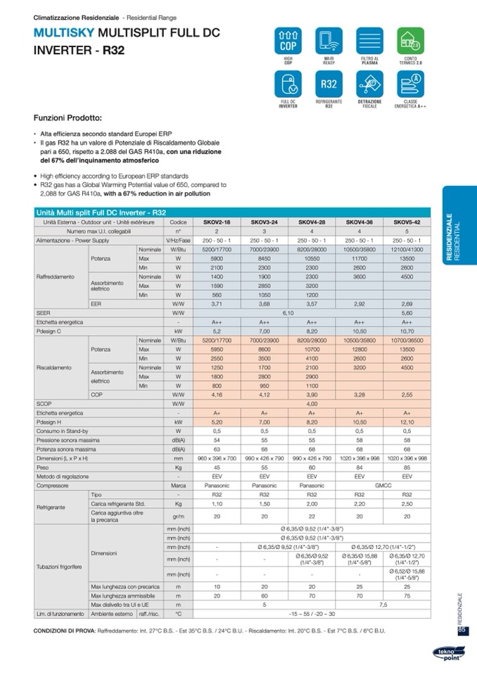 CONDIZIONI DI PROVA: Raffreddamento: Int. 27°C B.S. - Est 35°C B.S. / 24°C B.U. - Riscaldamento: Int. 20°C B.S. - Est 7°C B.S. / 6°C B.U.
