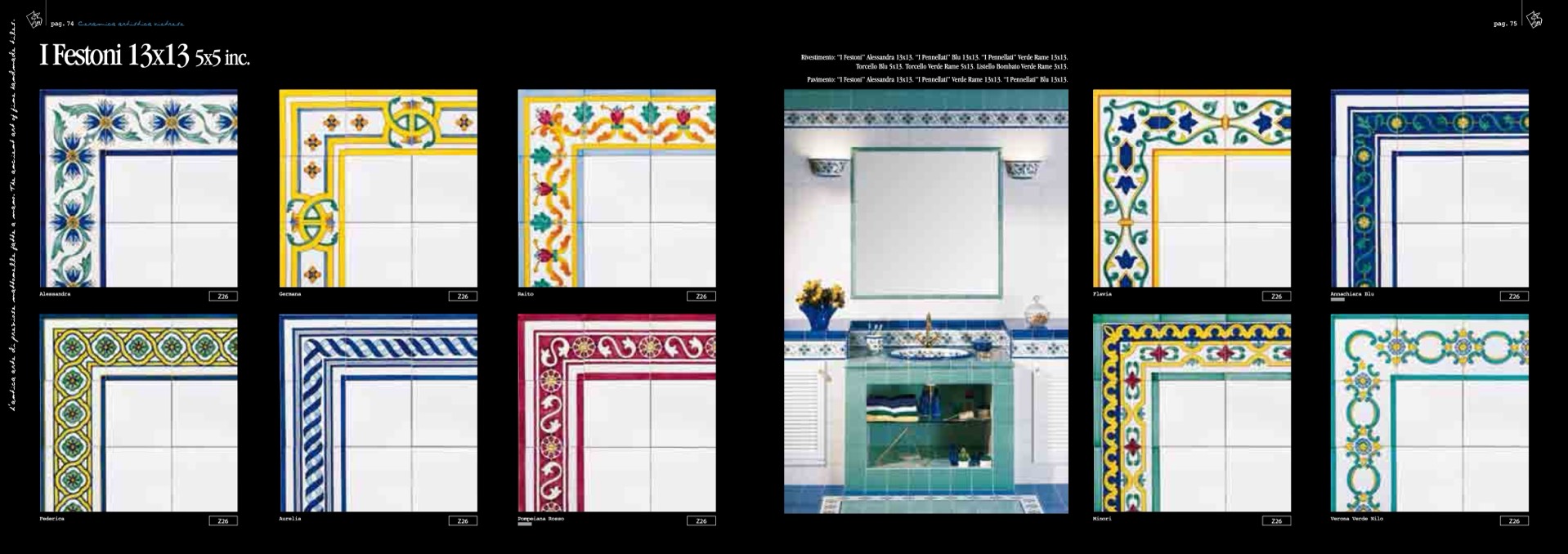 Pavimento: “I Festoni” Alessandra 13x13. “I Pennellati” Verde Rame 13x13. “I Pennellati” Blu 13x13.