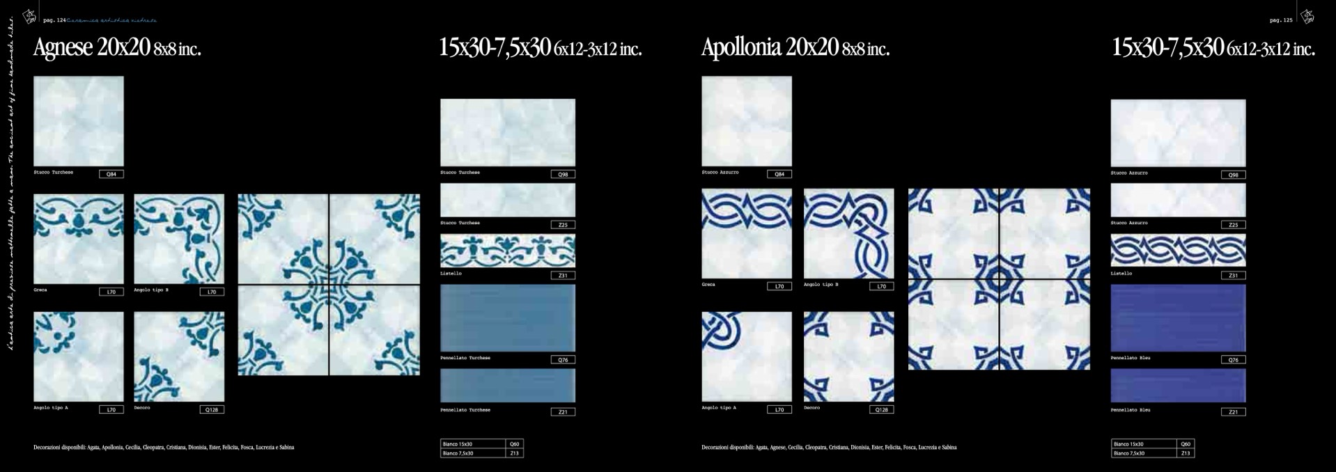 Decorazioni disponibili: Agata, Agnese, Cecilia, Cleopatra, Cristiana, Dionisia, Ester, Felicita, Fosca, Lucrezia e Sabina