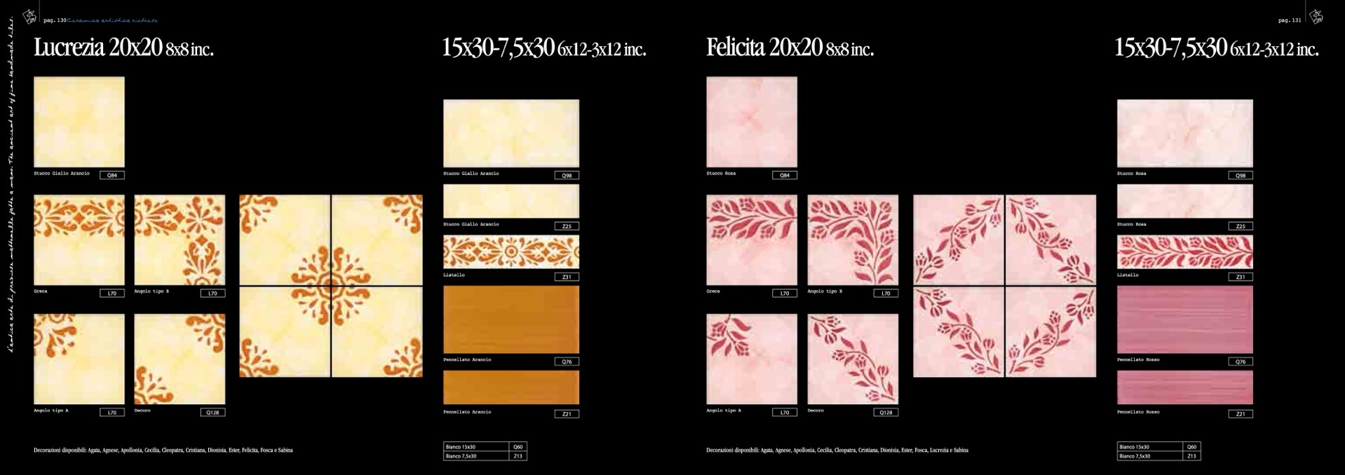 Decorazioni disponibili: Agata, Agnese, Apollonia, Cecilia, Cleopatra, Cristiana, Dionisia, Ester, Fosca, Lucrezia e Sabina