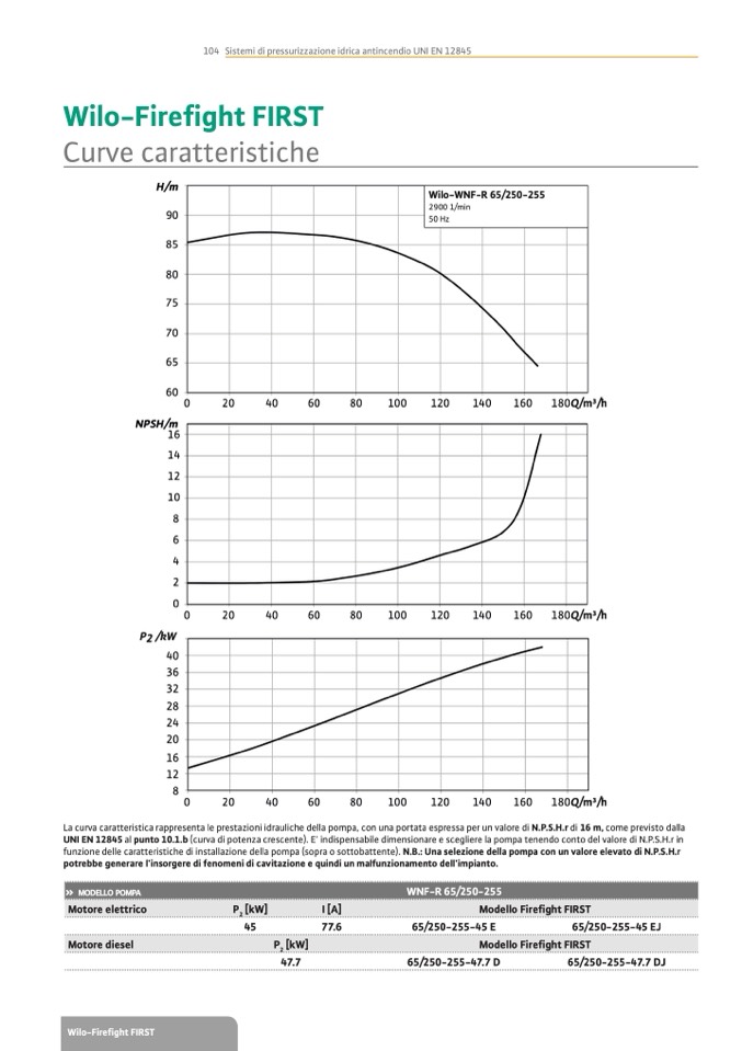 UNI EN 12845 al punto 10.1.b (curva di potenza crescente). E’ indispensabile dimensionare e scegliere la pompa tenendo conto del valore di N.P.S.H.r in