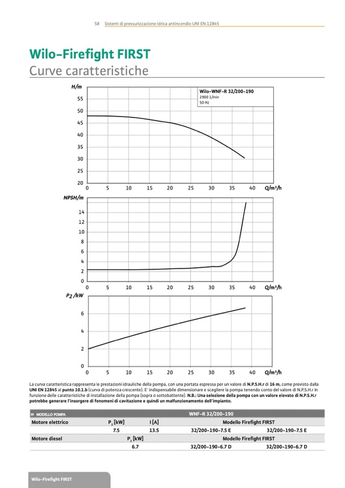 UNI EN 12845 al punto 10.1.b (curva di potenza crescente). E’ indispensabile dimensionare e scegliere la pompa tenendo conto del valore di N.P.S.H.r in