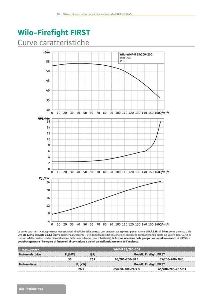 UNI EN 12845 al punto 10.1.b (curva di potenza crescente). E’ indispensabile dimensionare e scegliere la pompa tenendo conto del valore di N.P.S.H.r in