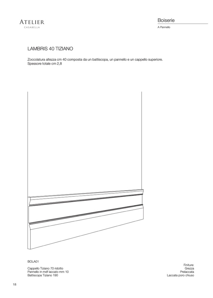 Zoccolatura altezza cm 40 composta da un battiscopa, un pannello e un cappello superiore.
