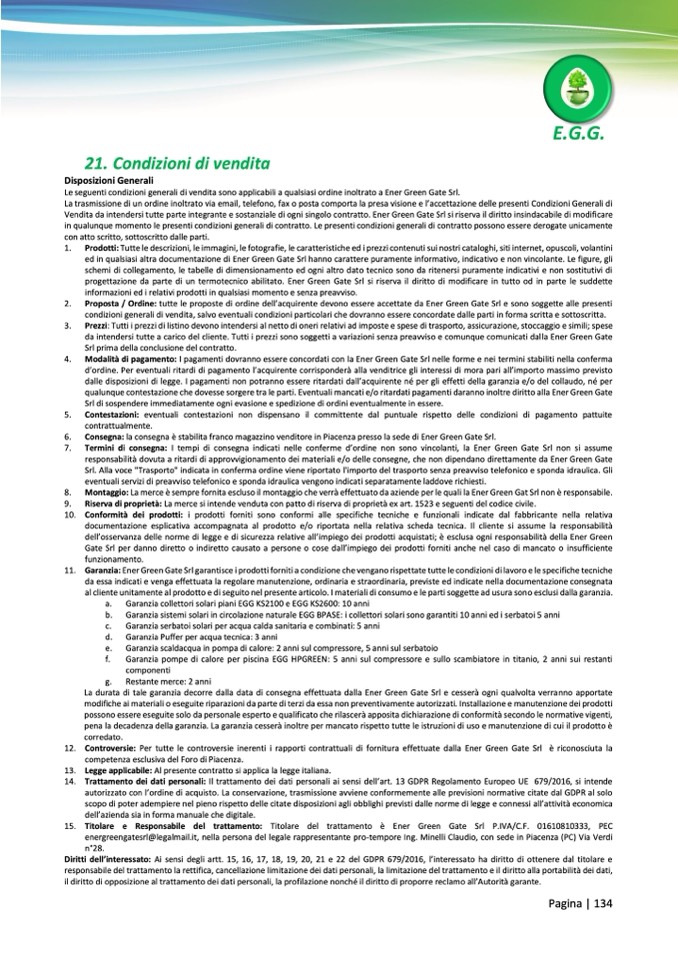 11. Garanzia: Ener Green Gate Srl garantisce i prodotti forniti a condizione che vengano rispettate tutte le condizioni di lavoro e le specifiche tecniche