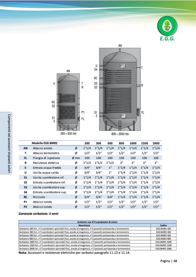 Serbatoio 500 litri, n°2 scambiatori spiroidali fissi, anodo al magnesio, n°2 pozzetti portasonda e termometro