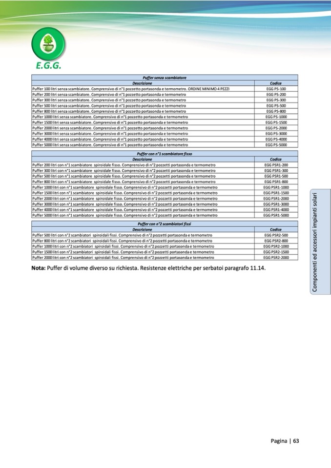 Nota: Puffer di volume diverso su richiesta. Resistenze elettriche per serbatoi paragrafo 11.14.
