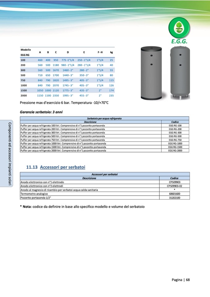 * Nota: codice da definire in base allo specifico modello e volume del serbatoio