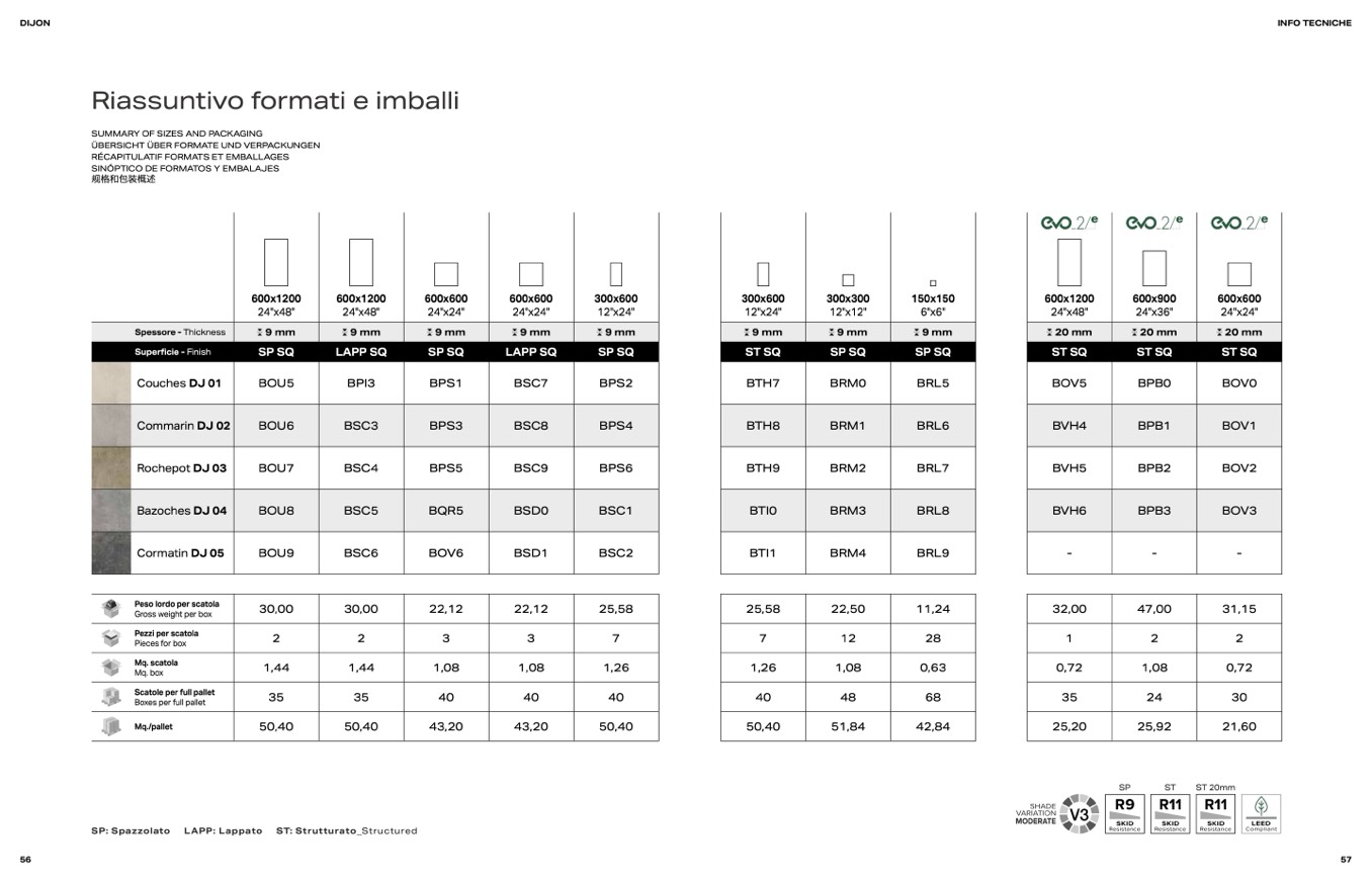 SUMMARY OF SIZES AND PACKAGING