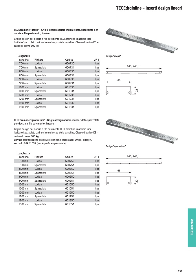 TECEdrainline "drops" - Griglia design acciaio inox lucidato/spazzolato per
