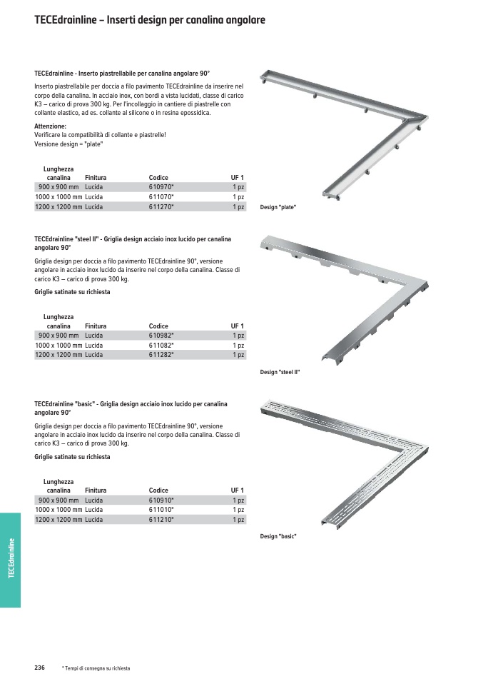 corpo della canalina. In acciaio inox, con bordi a vista lucidati, classe di carico