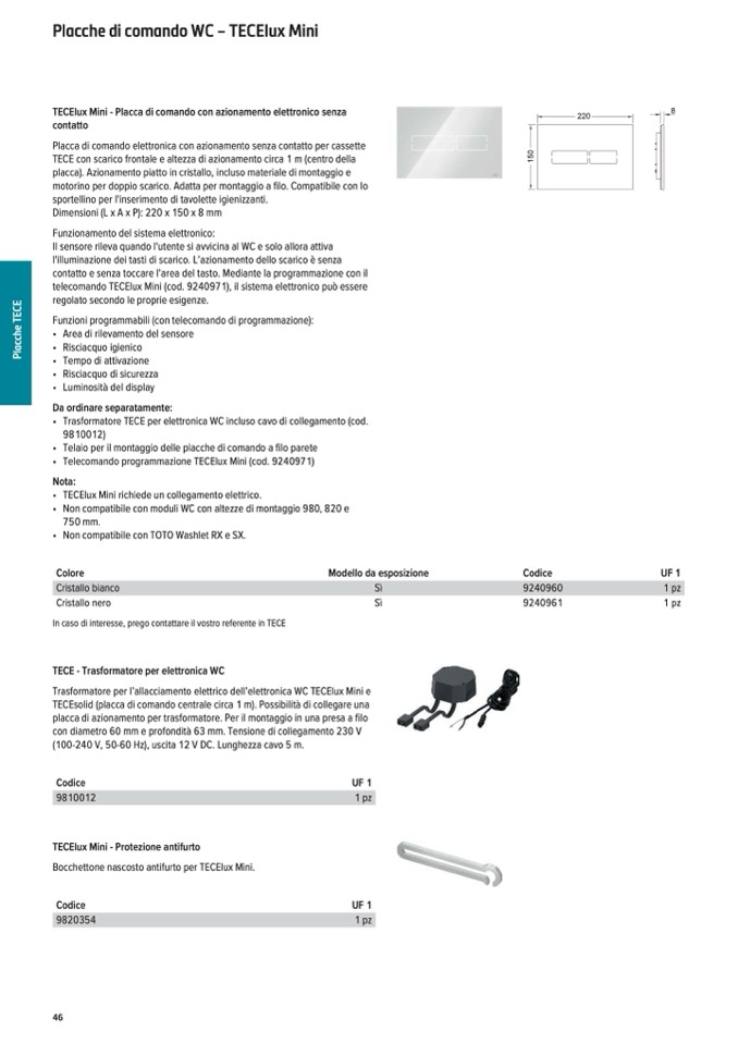 • Trasformatore TECE per elettronica WC incluso cavo di collegamento (cod.